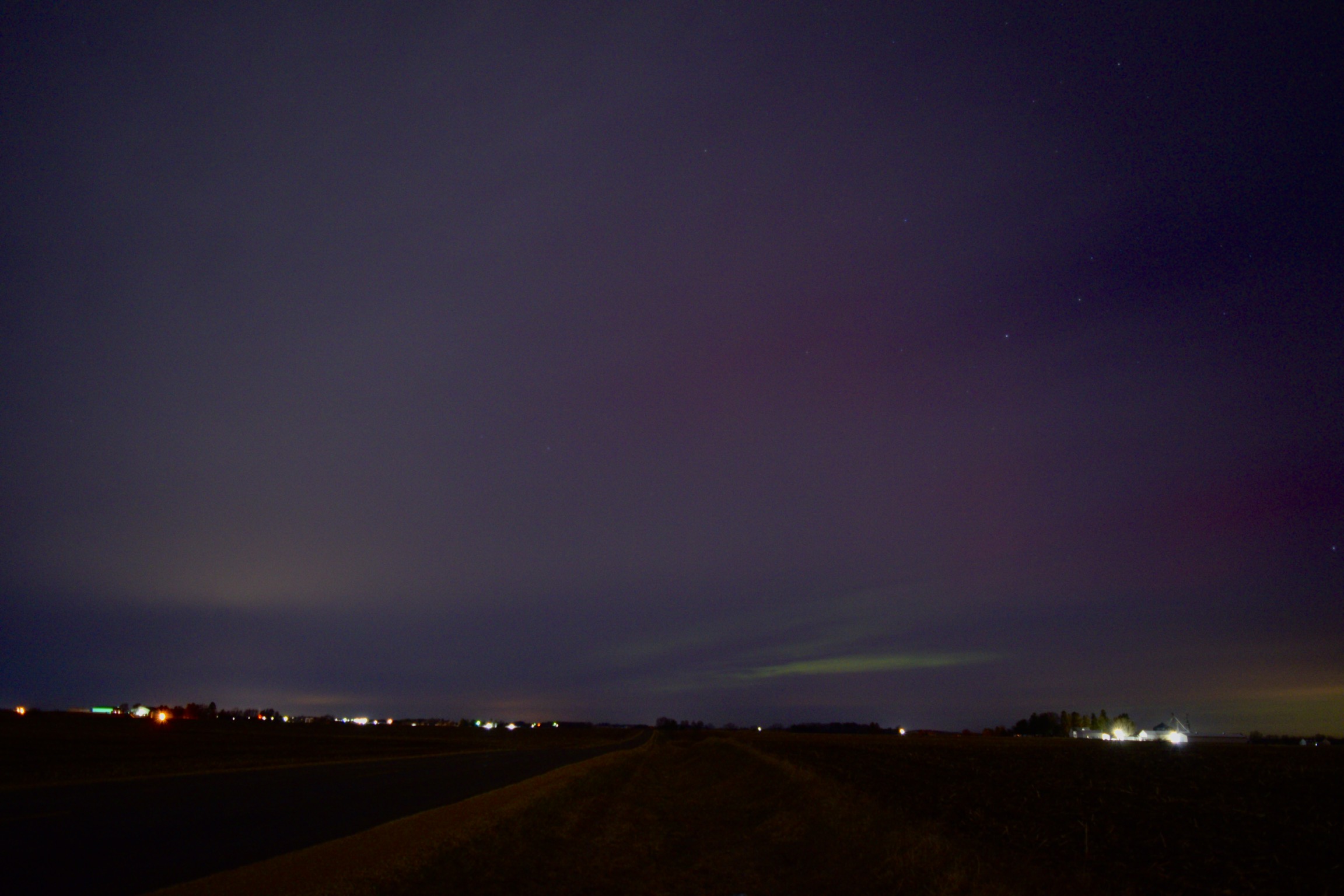 Detected the northern lights last night, despite hazy clouds. You can see the green glow through the gap, and the purple coloration above is probably due to the red top part of the aurora shining through the clouds.