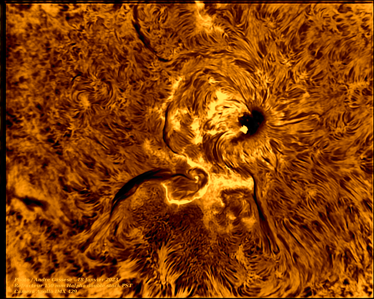 This January 18, 2023 magnificent big spot with a double ejection that we see rising like a huge lasso, the luminous point in the spot and one of the ejection zones.