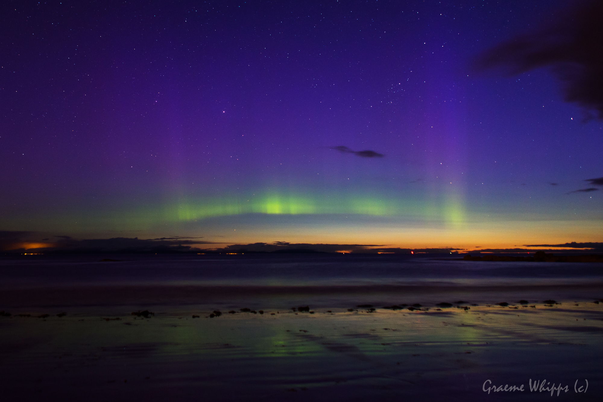 Following a prolonged spell of southward bz, I decided for a drive last night in search of clearer skies, and had an excellent night on Hopeman beach near Lossiemouth. At first I thought I had made a mistake driving into the clouds and rain, but the skies cleared as forecast and the dancers came out.
